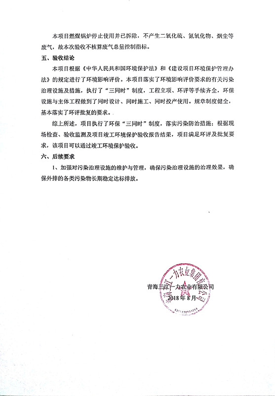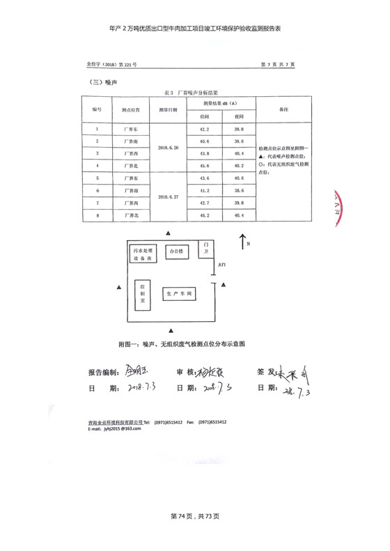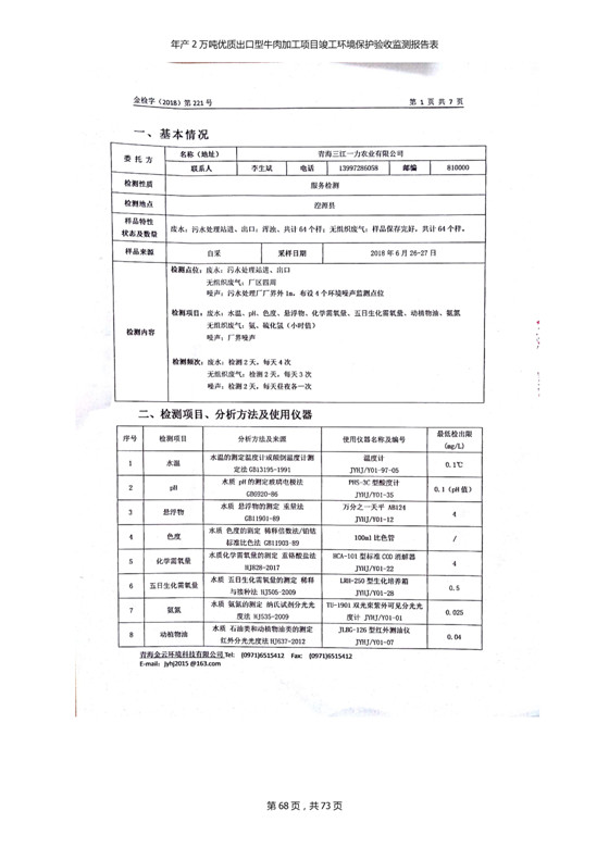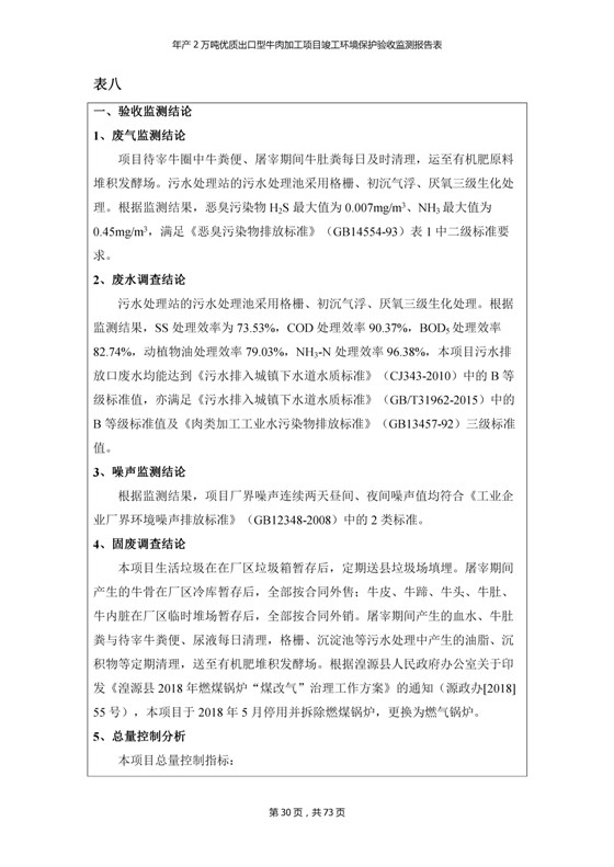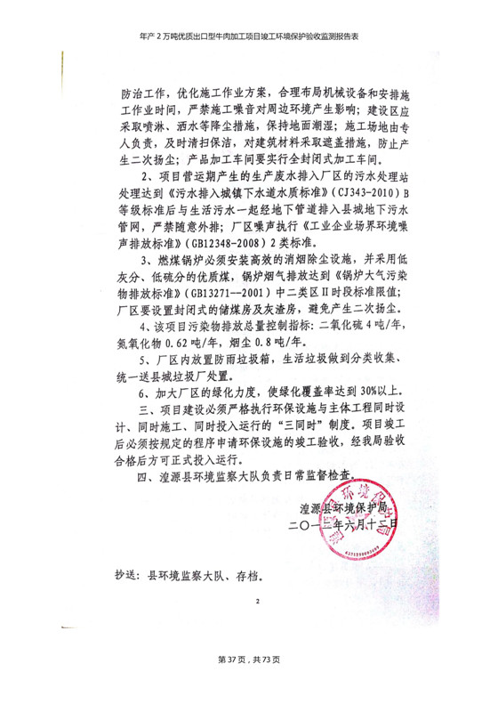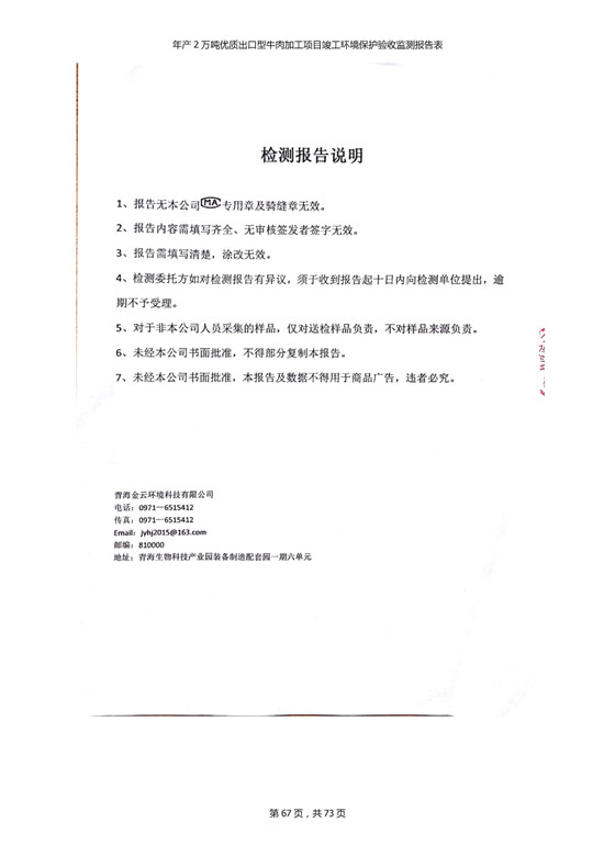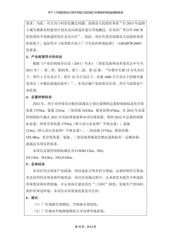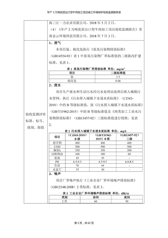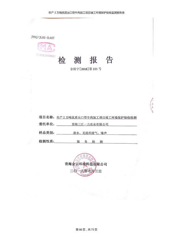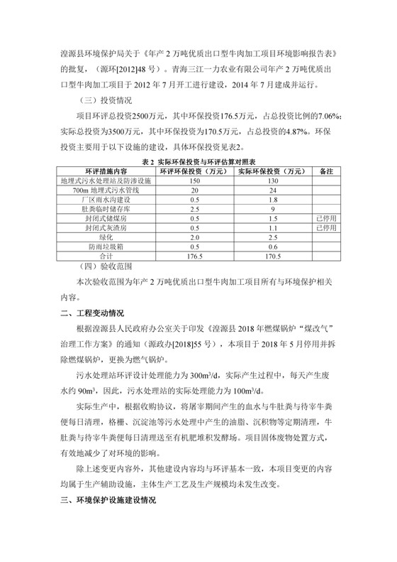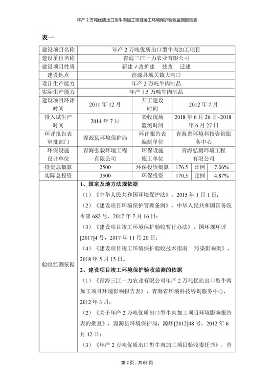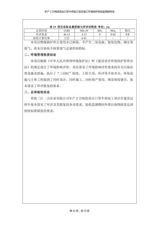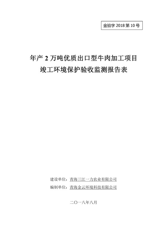 根據(jù)中華人民共和國國務(wù)院令第253號《建設(shè)項目環(huán)境保護管理條例》(中華人民共和國國務(wù)院令第682號《國務(wù)院關(guān)于修改〈建設(shè)項目環(huán)境保護管理條例〉的決定》和《建設(shè)項目竣工環(huán)境保護驗收暫行辦法》,嚴格依照有關(guān)法律法規(guī),建設(shè)項目環(huán)境保護設(shè)施驗收技術(shù)規(guī)范,本項目環(huán)評報告表和環(huán)保審批部門審批意見以及企業(yè)自行驗收相關(guān)要求等對本項目進行驗收,本項目符合環(huán)保驗收條件,可以通過環(huán)保驗收。 青海三江一力農(nóng)業(yè)有限公司組織召開年產(chǎn)2萬噸優(yōu)質(zhì)出口型牛肉加工項目(一期工程)驗收組意見.