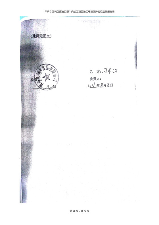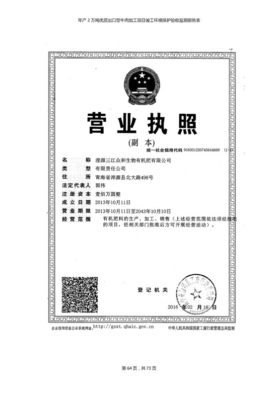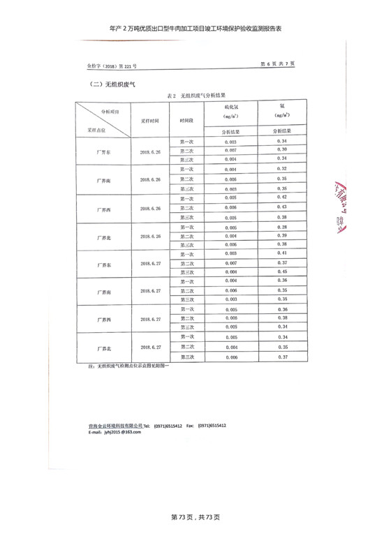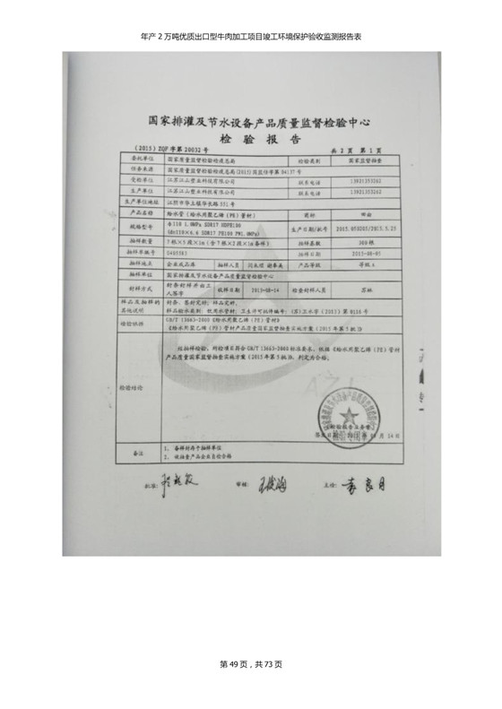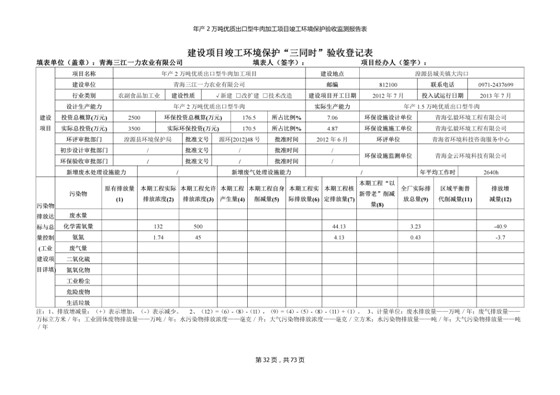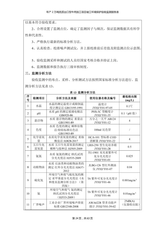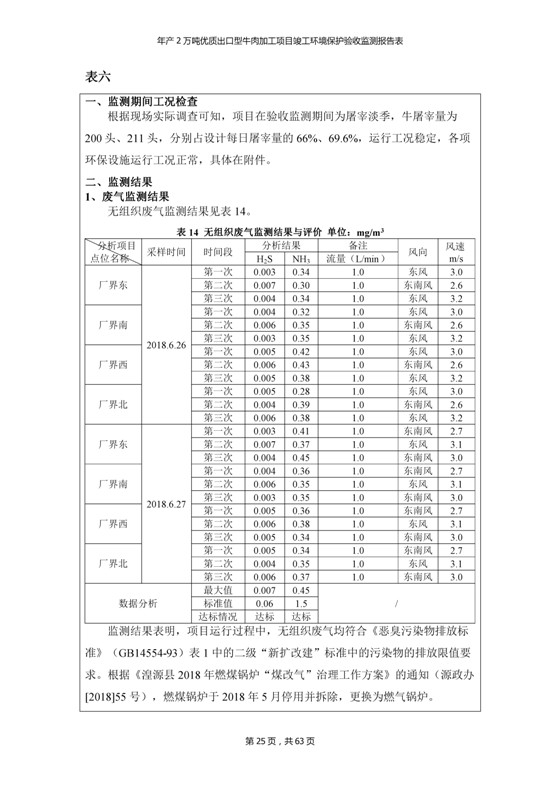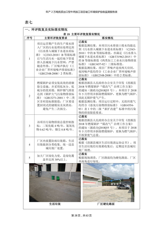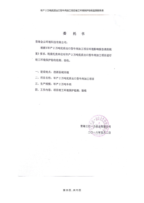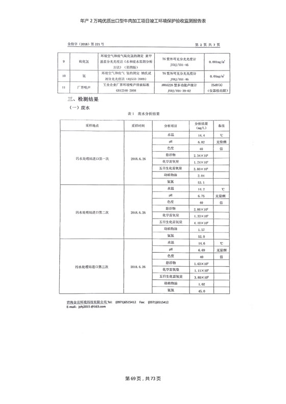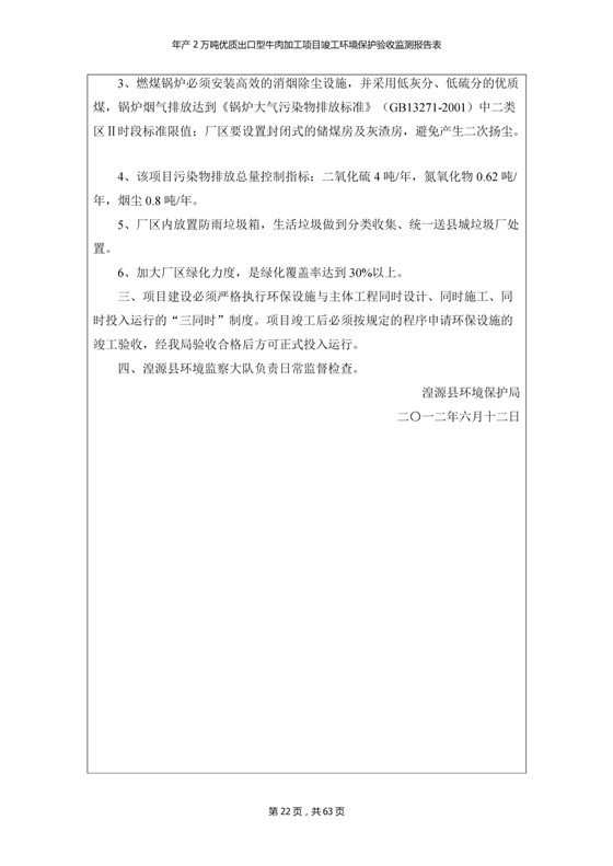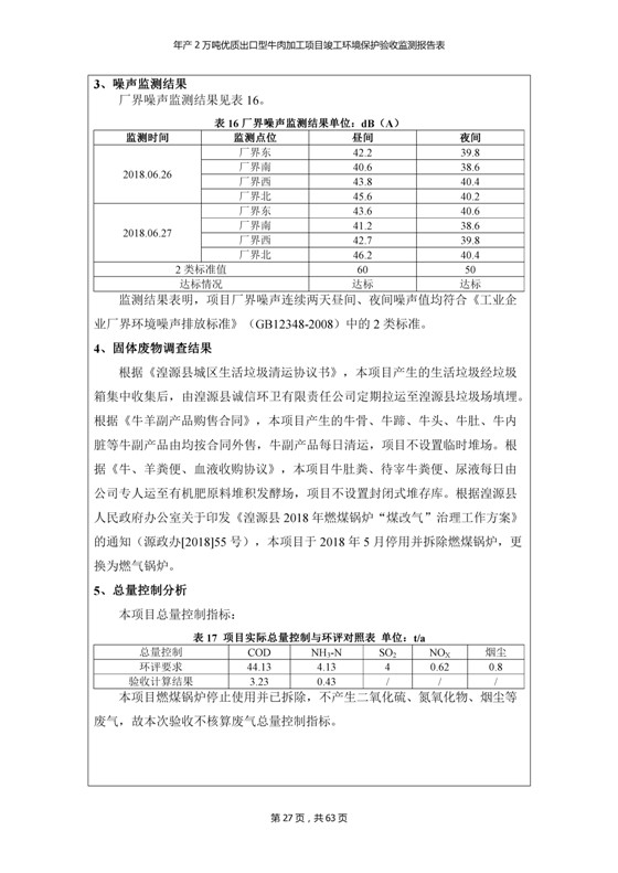 根據(jù)中華人民共和國國務(wù)院令第253號《建設(shè)項目環(huán)境保護管理條例》(中華人民共和國國務(wù)院令第682號《國務(wù)院關(guān)于修改〈建設(shè)項目環(huán)境保護管理條例〉的決定》和《建設(shè)項目竣工環(huán)境保護驗收暫行辦法》,嚴格依照有關(guān)法律法規(guī),建設(shè)項目環(huán)境保護設(shè)施驗收技術(shù)規(guī)范,本項目環(huán)評報告表和環(huán)保審批部門審批意見以及企業(yè)自行驗收相關(guān)要求等對本項目進行驗收,本項目符合環(huán)保驗收條件,可以通過環(huán)保驗收。 青海三江一力農(nóng)業(yè)有限公司組織召開年產(chǎn)2萬噸優(yōu)質(zhì)出口型牛肉加工項目(一期工程)驗收組意見.