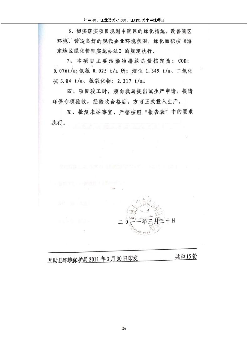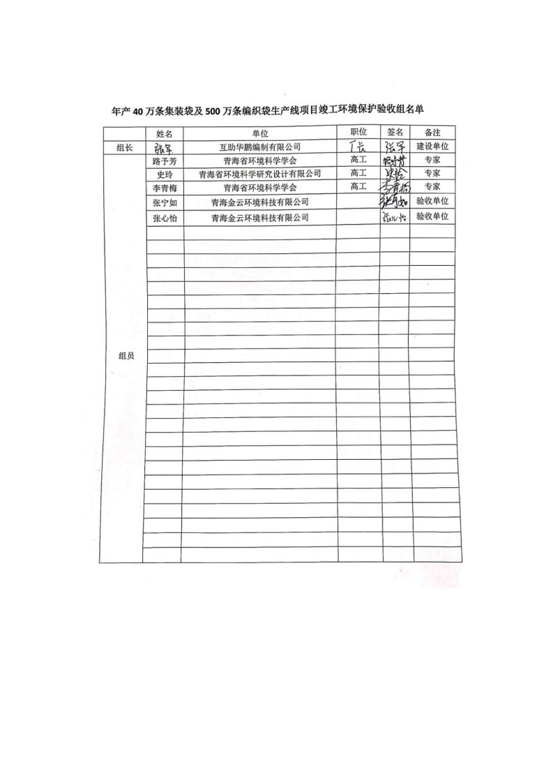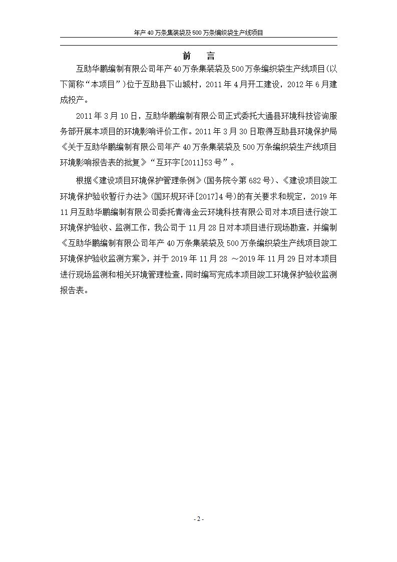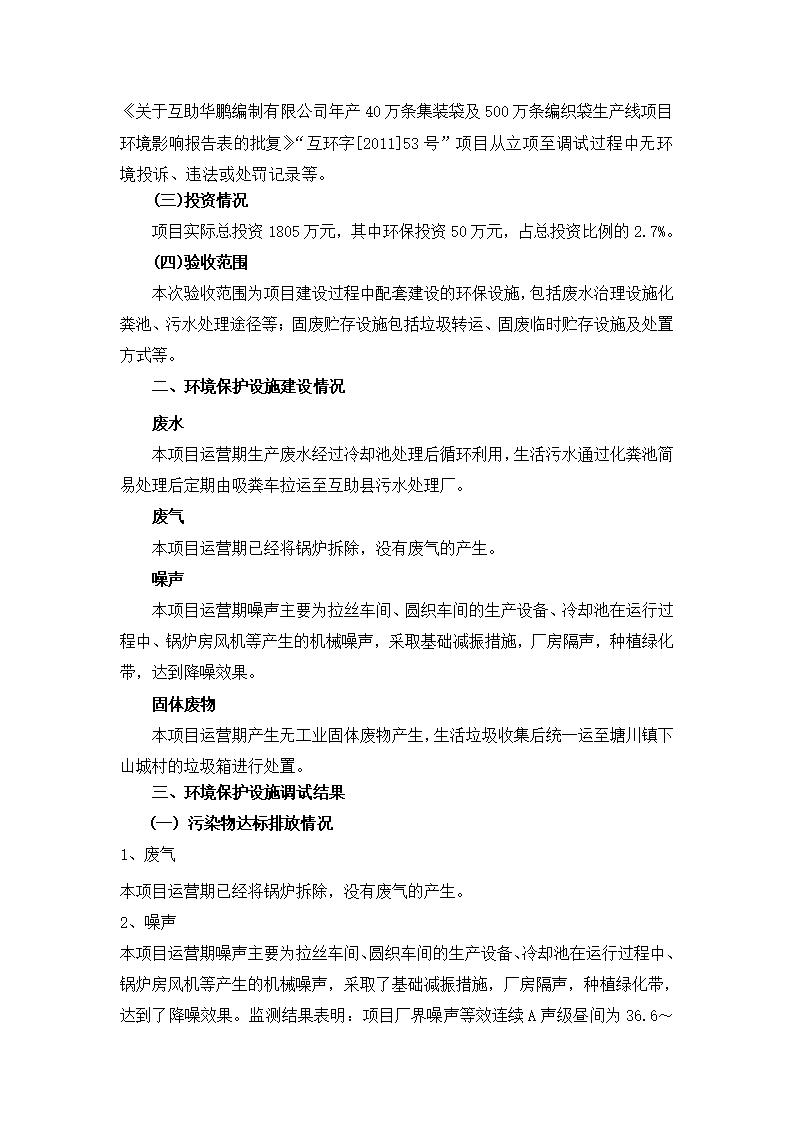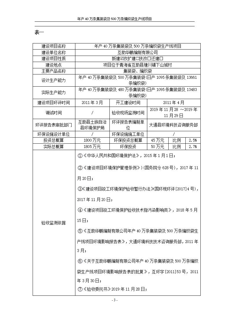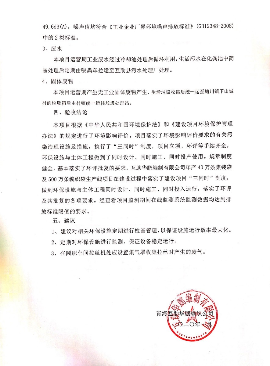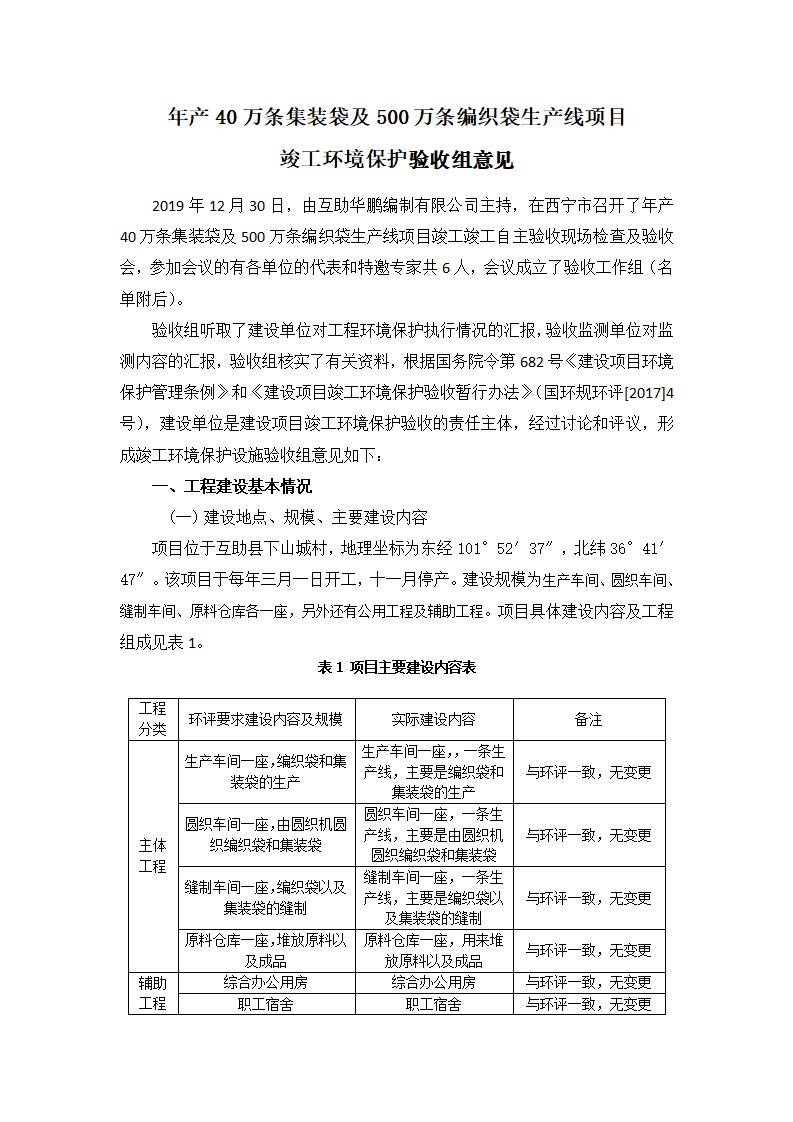 根據(jù)中華人民共和國(guó)國(guó)務(wù)院令第682號(hào)《國(guó)務(wù)院關(guān)于修改〈建設(shè)項(xiàng)目環(huán)境保護(hù)管理?xiàng)l例〉的決定》和《建設(shè)項(xiàng)目竣工環(huán)境保護(hù)驗(yàn)收暫行辦法》(國(guó)務(wù)院令682號(hào)),年產(chǎn)40萬條集裝袋及500萬條編織袋生產(chǎn)線項(xiàng)目(包括竣工環(huán)境保護(hù)驗(yàn)收調(diào)查表和驗(yàn)收意見)公示如下。 一、項(xiàng)目名稱: 年產(chǎn)40萬條集裝袋及500萬條編織袋生產(chǎn)線項(xiàng)目 二、地點(diǎn):互助縣塘川鎮(zhèn)下山城村 五、聯(lián)系人:張工 六、聯(lián)系電話:0971-6515411 七、公示時(shí)間:二〇二〇年一月十三日至二〇二〇年二月十二日 公示期間,對(duì)上述公示內(nèi)容如有異議,請(qǐng)以書面形式反饋,個(gè)人須署真實(shí)姓名,單位須加蓋公章。