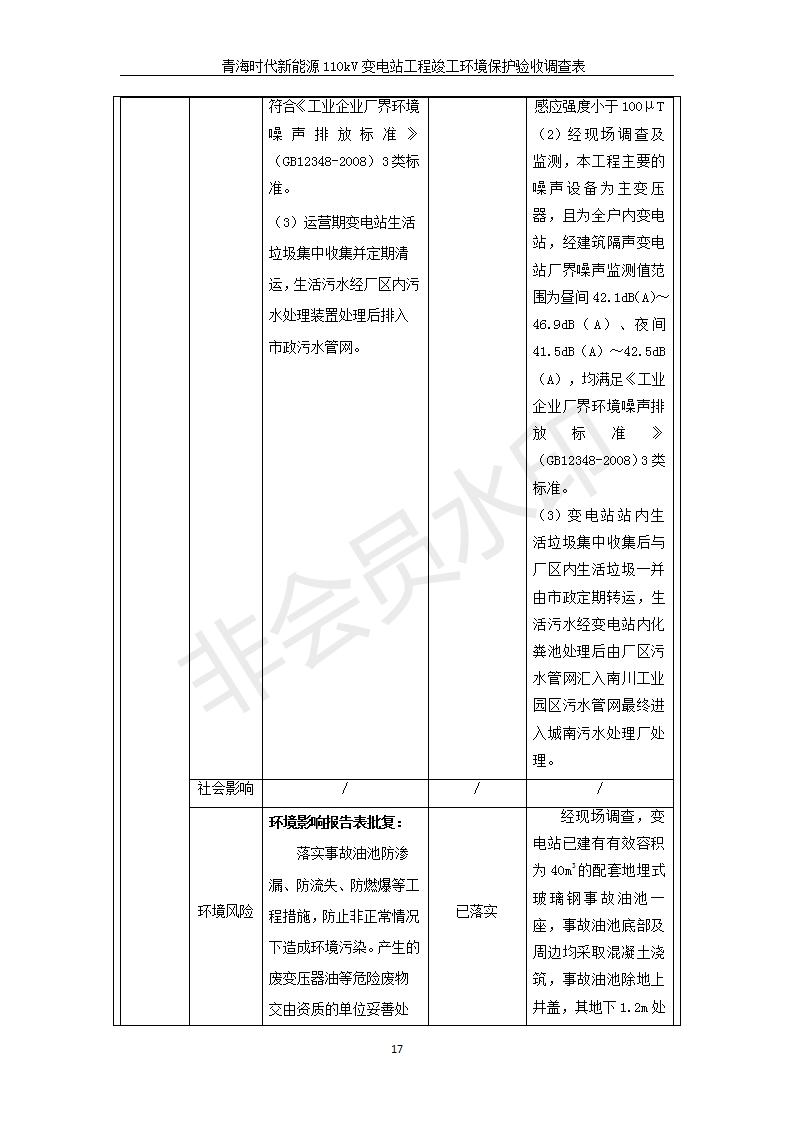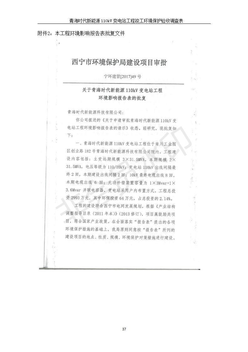 根據(jù)中華人民共和國國務(wù)院令第682號《國務(wù)院關(guān)于修改〈建設(shè)項目環(huán)境保護管理條例〉的決定》和《建設(shè)項目竣工環(huán)境保護驗收暫行辦法》(國務(wù)院令682號),青海時代新能源110kV變電站工程(包括竣工環(huán)境保護驗收調(diào)查表和驗收意見)公示如下。 一、項目名稱:青海時代新能源110kV變電站工程 二、地點:青海省西寧市南川工業(yè)園區(qū)創(chuàng)業(yè)路182號青海時代新能源科技有限公司廠區(qū)內(nèi) 三、建設(shè)單位:青海時代新能源科技有限公司 四、建設(shè)內(nèi)容:青海時代新能源 110kV 變電站采用全戶內(nèi)布置方式,依據(jù)環(huán)評報告及批復(fù)文件,經(jīng)現(xiàn)場踏勘本工程建設(shè)只包含變電站建設(shè)部分,輸電線路由南川工業(yè)園區(qū)管委會負(fù)責(zé)建設(shè),輸電線路不屬于本次驗收調(diào)查范圍。工程本期規(guī)模2×31.5MVA,電壓等級為110/10kV。變電站 110kV 出線間隔最終2回,本期建設(shè)出線間隔2回;10kV最終電纜出線8回,本期電纜出線6回。 五、聯(lián)系人:張工 六、聯(lián)系電話:0971-6515411 七、公示時間:二〇二〇年一月十四日至二〇二〇年二月十三日 公示期間,對上述公示內(nèi)容如有異議,請以書面形式反饋,個人須署真實姓名,單位須加蓋公章。